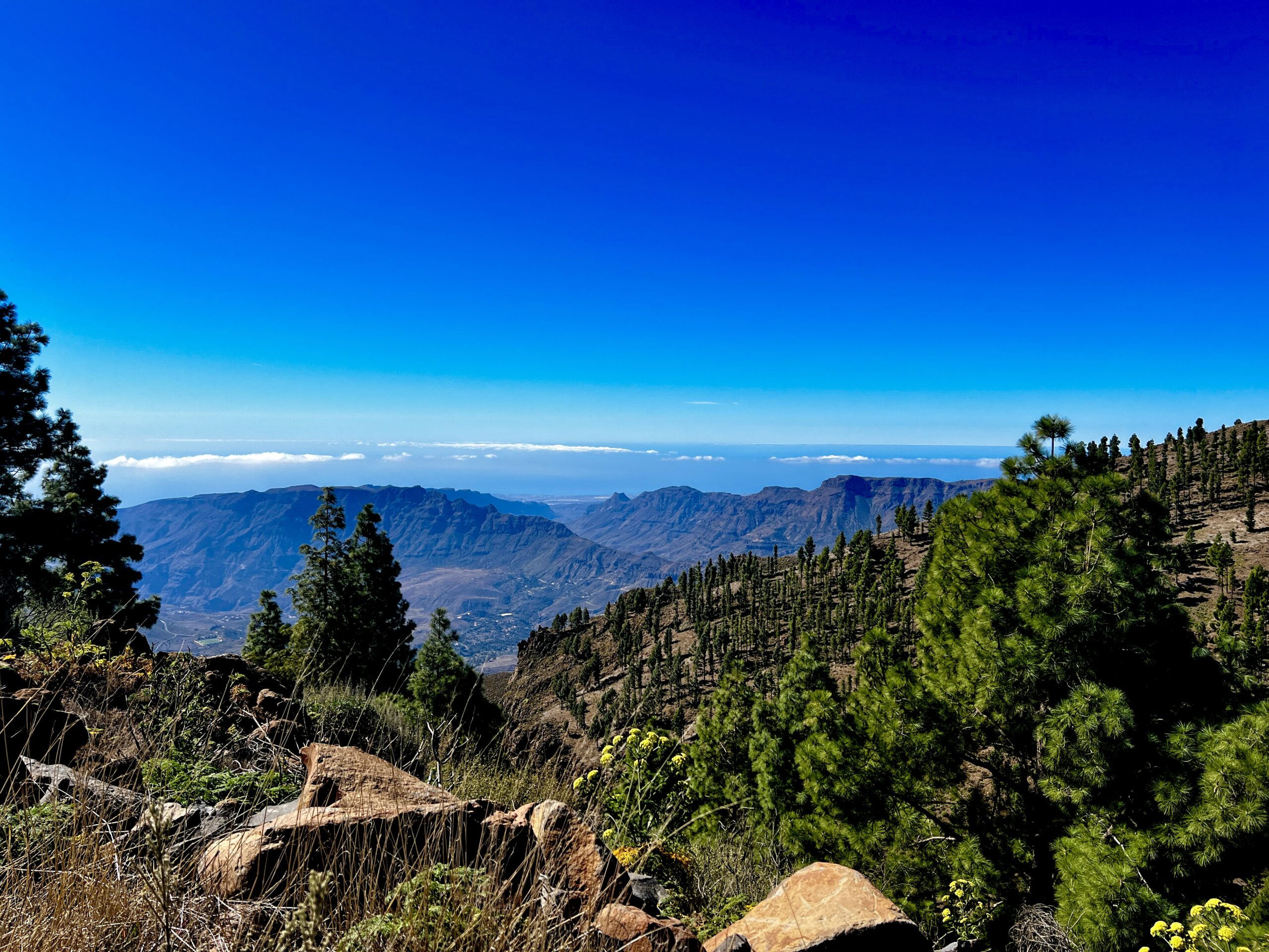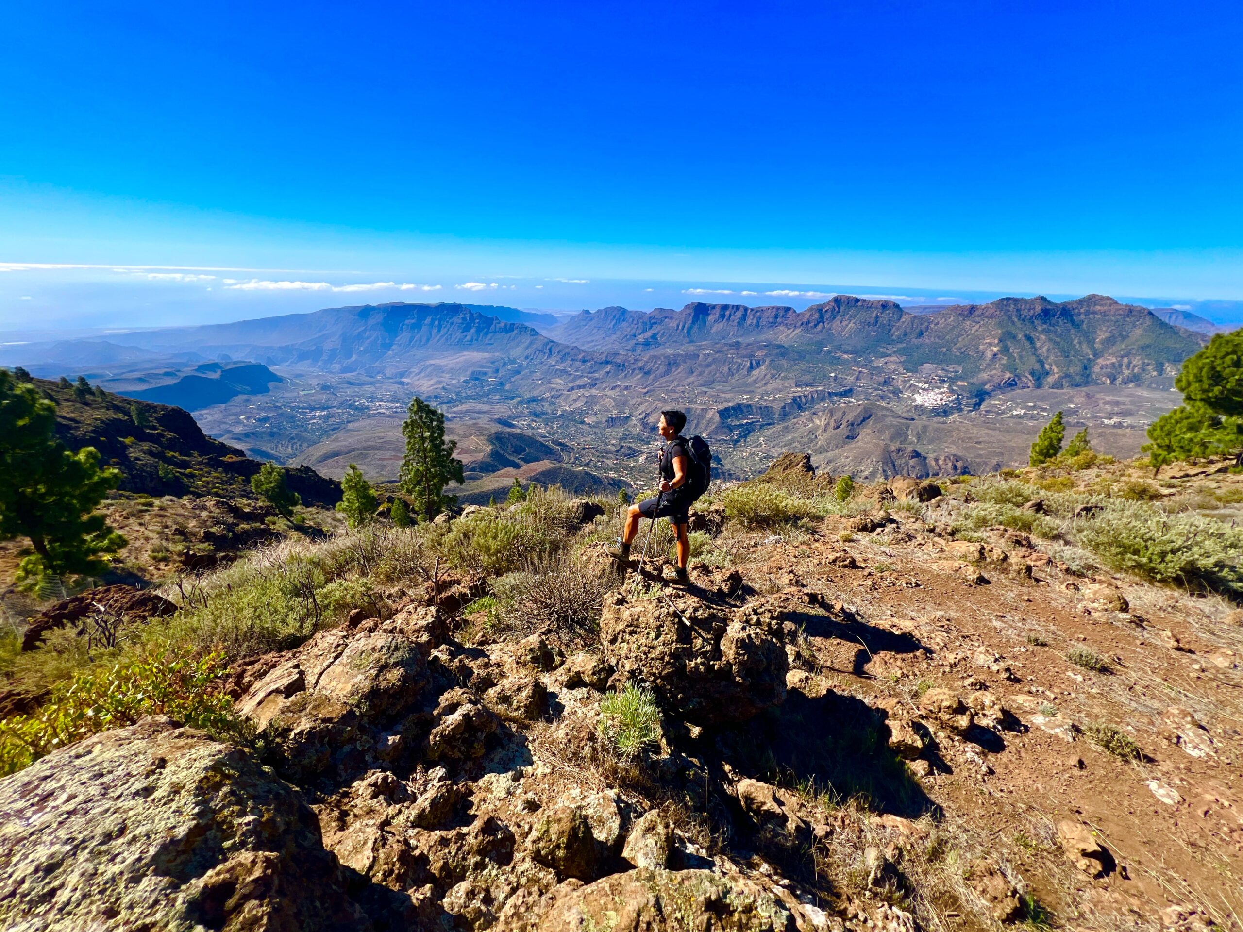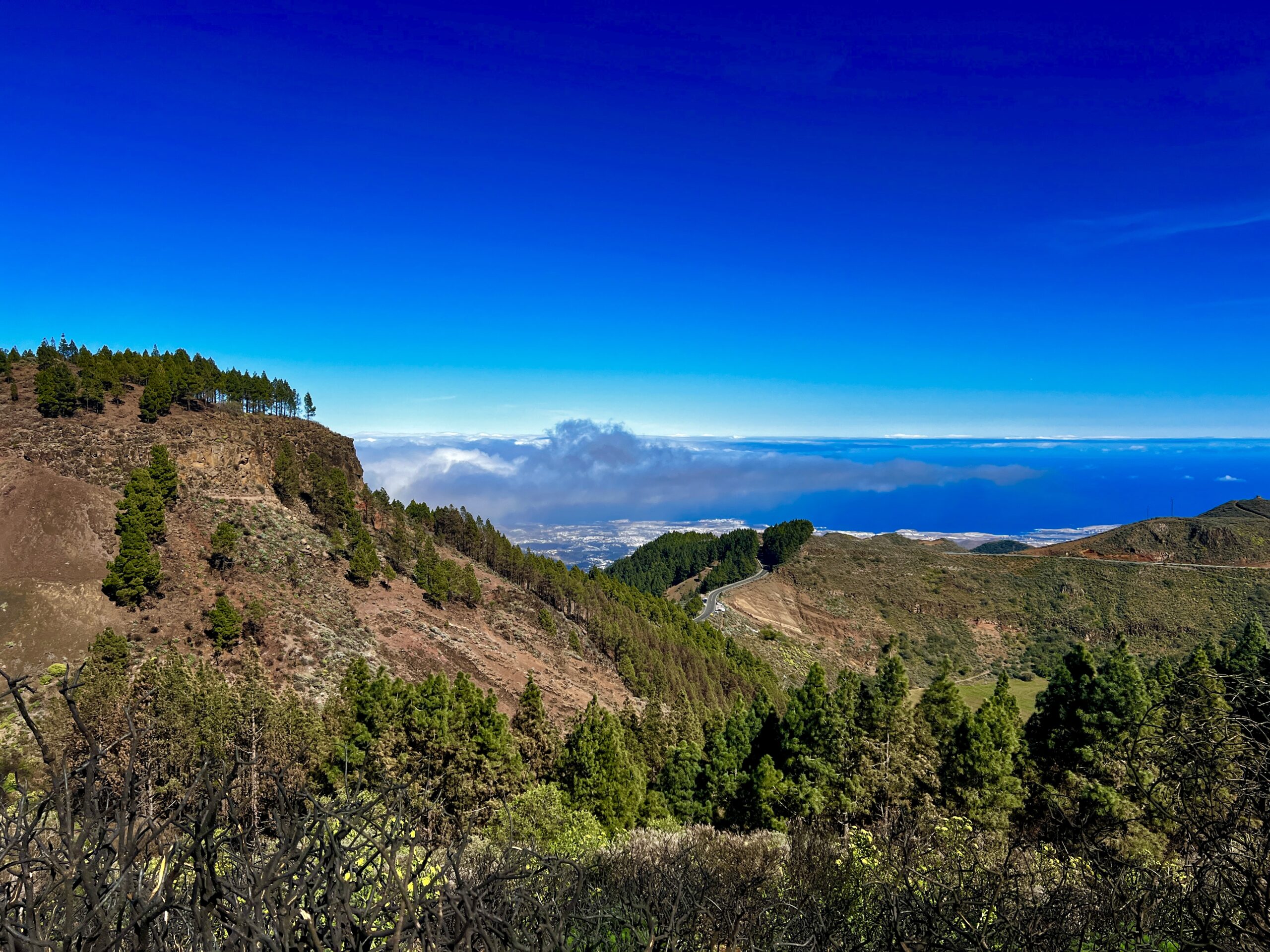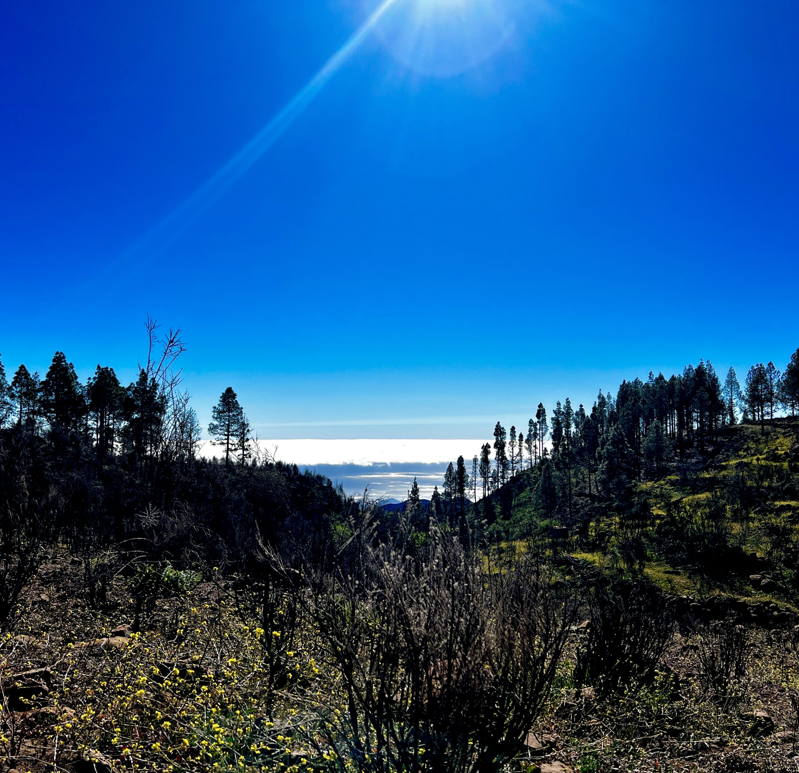 Unsere Tour startete an einer Steilkurve der Lugar Cuevas Blancas (GC-130), wo man bequem sein Auto abstellen kann. Der Weg folgt zunächst durch eine sanft gewellte, von lichten Kiefernhainen durchsetzte Landschaft, die leider in 2022 dem Brand zum Opfer gefallen ist. Man kann hier aber sehr gut sehen, wie die Natur sich selbst regeneriert. Wir folgen der Ausschilderung Santa Lucia und sehen im Südwesten den kuppelförmig aufragenden Montañón (1783m). Bevor wir unserem Wanderweg in Richtung Cruz del Socorro weiter folgten, biegen wir rechts ab in Richtung Santa Lucia, um den grandiosen Ausblick auf das Dorf und auf San Bartolome zu genießen.