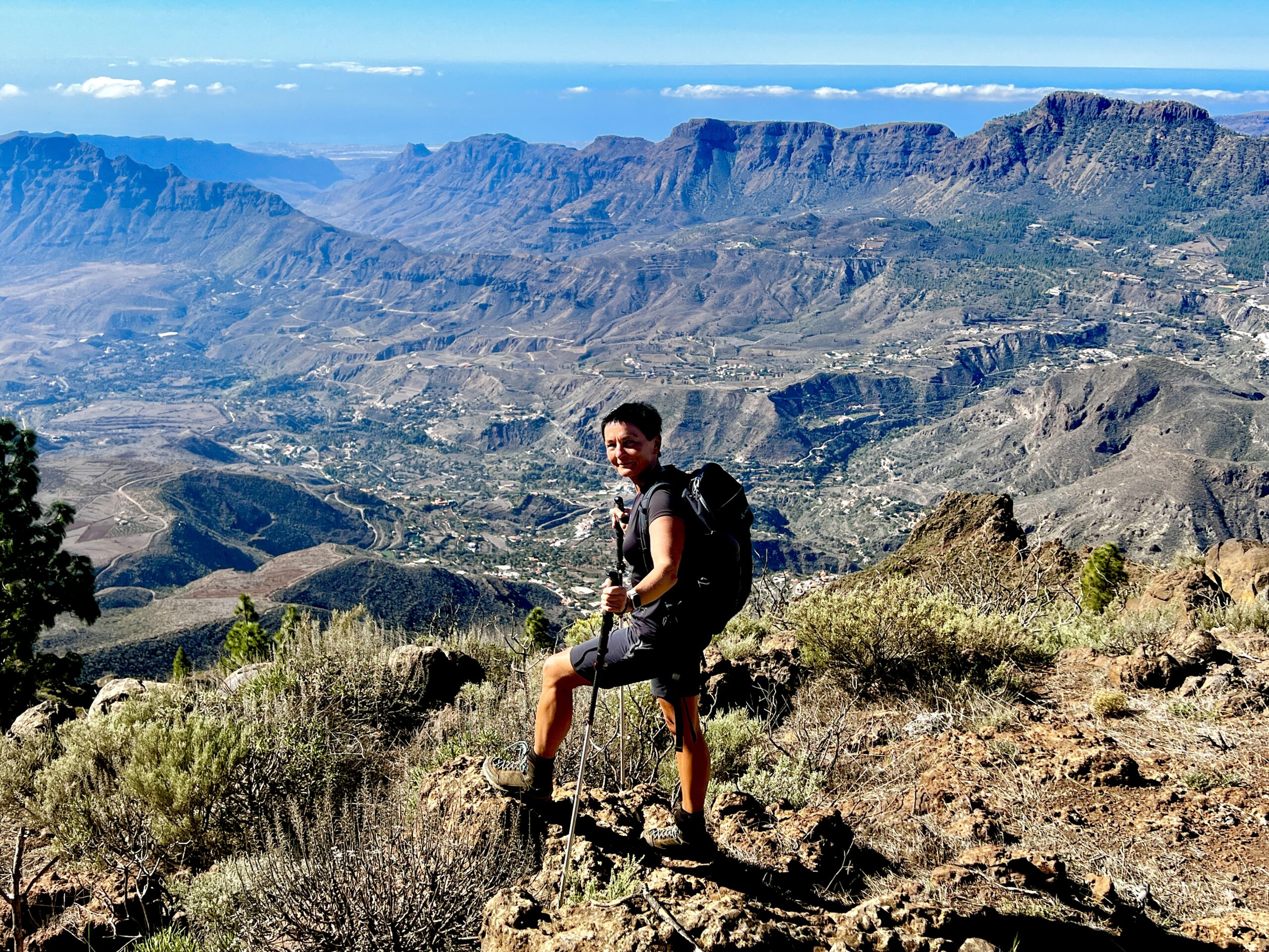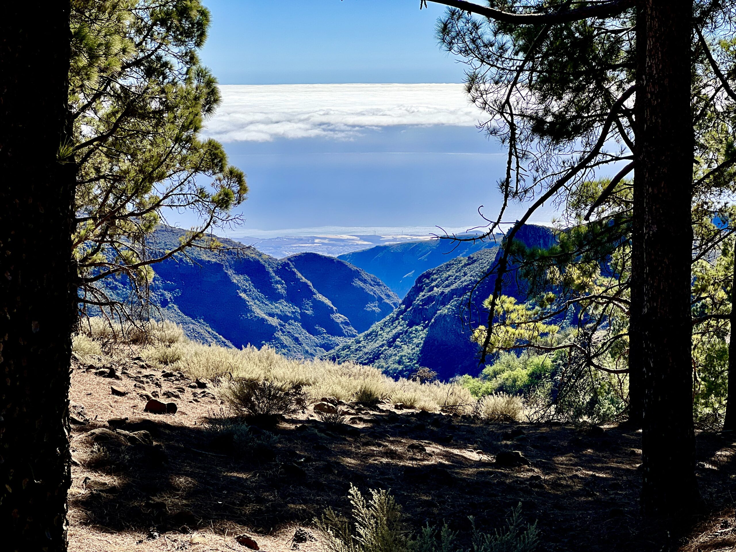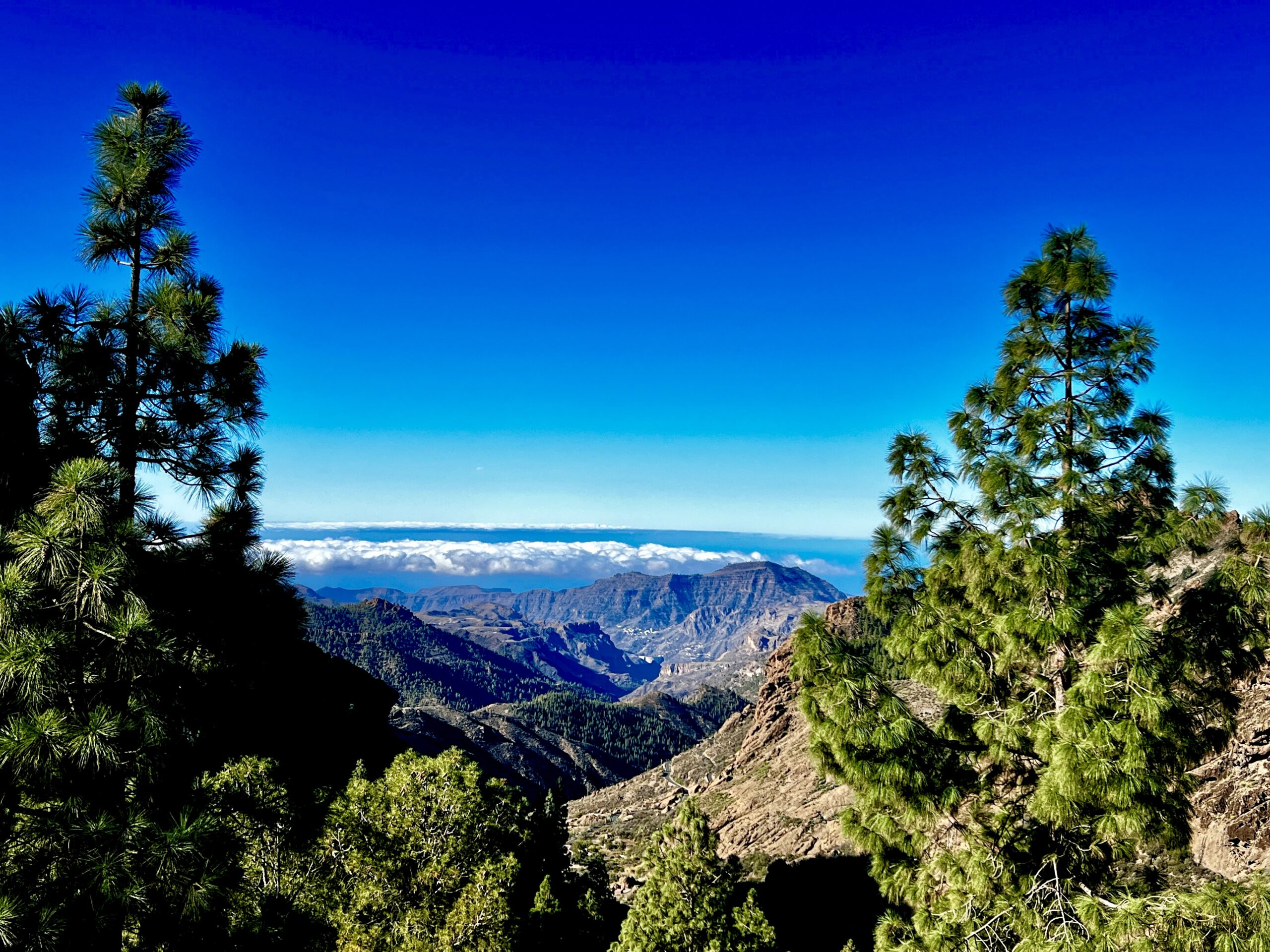 Unsere Tour startete an einer Steilkurve der Lugar Cuevas Blancas (GC-130), wo man bequem sein Auto abstellen kann. Der Weg folgt zunächst durch eine sanft gewellte, von lichten Kiefernhainen durchsetzte Landschaft, die leider in 2022 dem Brand zum Opfer gefallen ist. Man kann hier aber sehr gut sehen, wie die Natur sich selbst regeneriert. Wir folgen der Ausschilderung Santa Lucia und sehen im Südwesten den kuppelförmig aufragenden Montañón (1783m). Bevor wir unserem Wanderweg in Richtung Cruz del Socorro weiter folgten, biegen wir rechts ab in Richtung Santa Lucia, um den grandiosen Ausblick auf das Dorf und auf San Bartolome zu genießen.