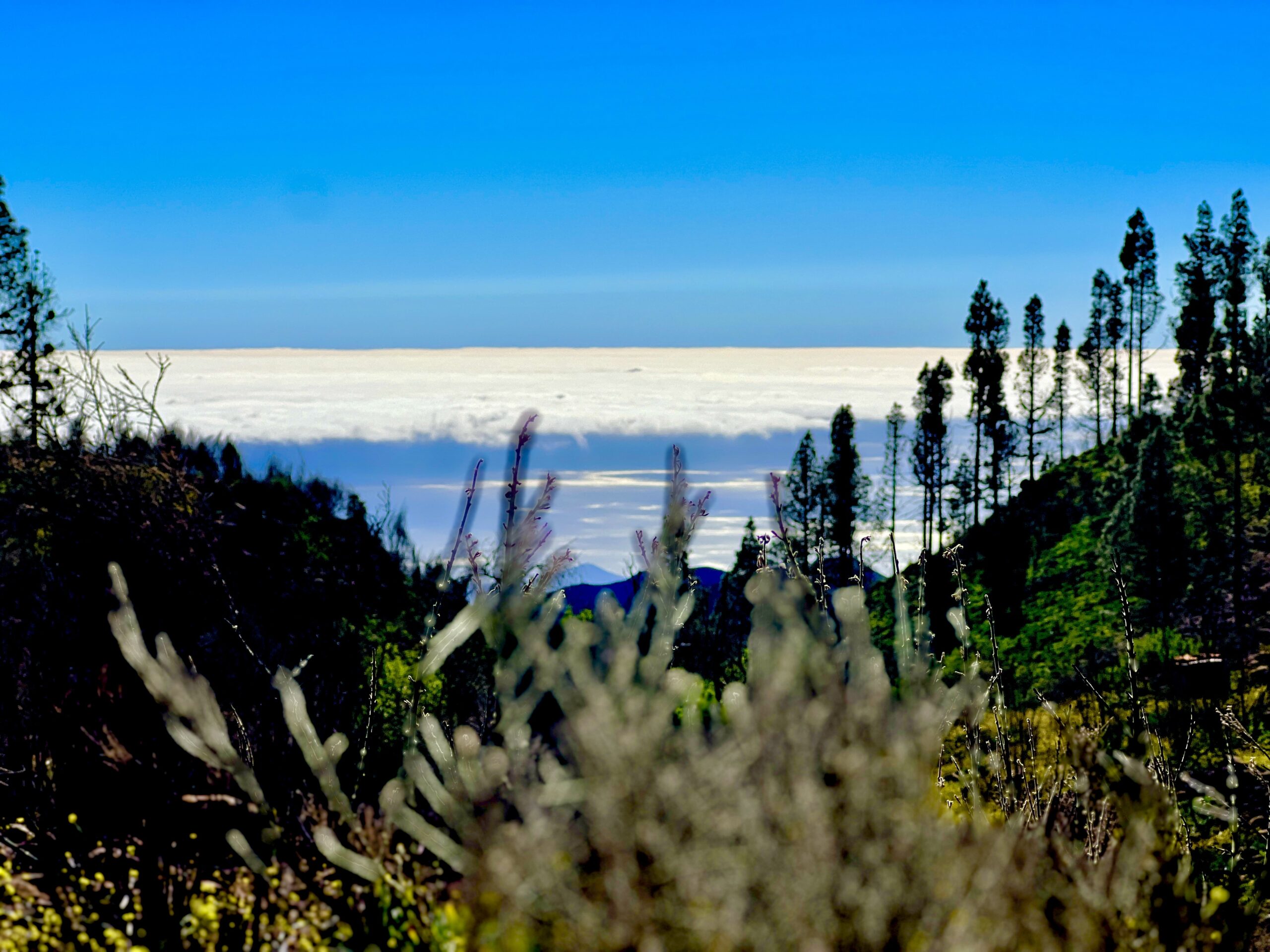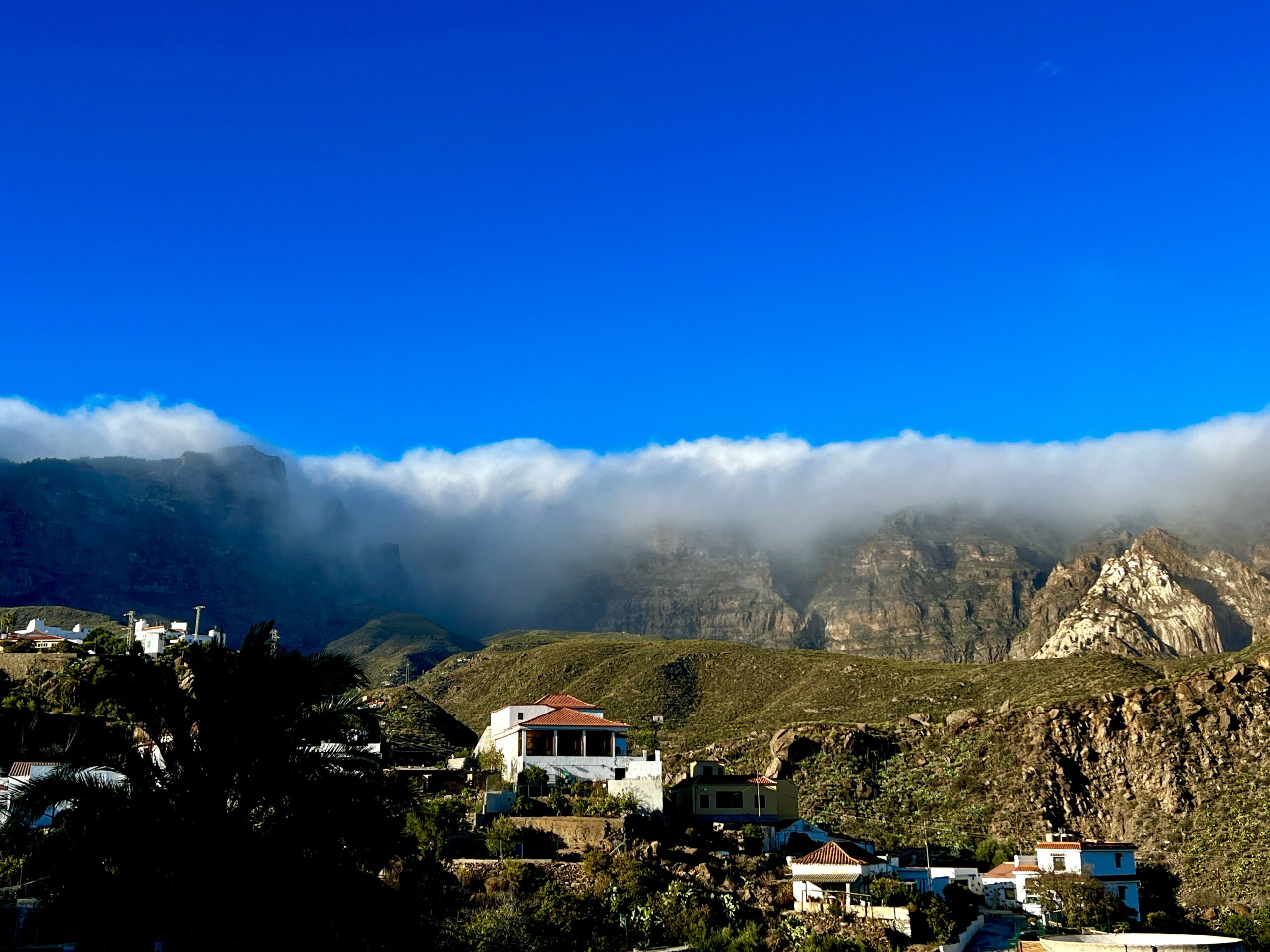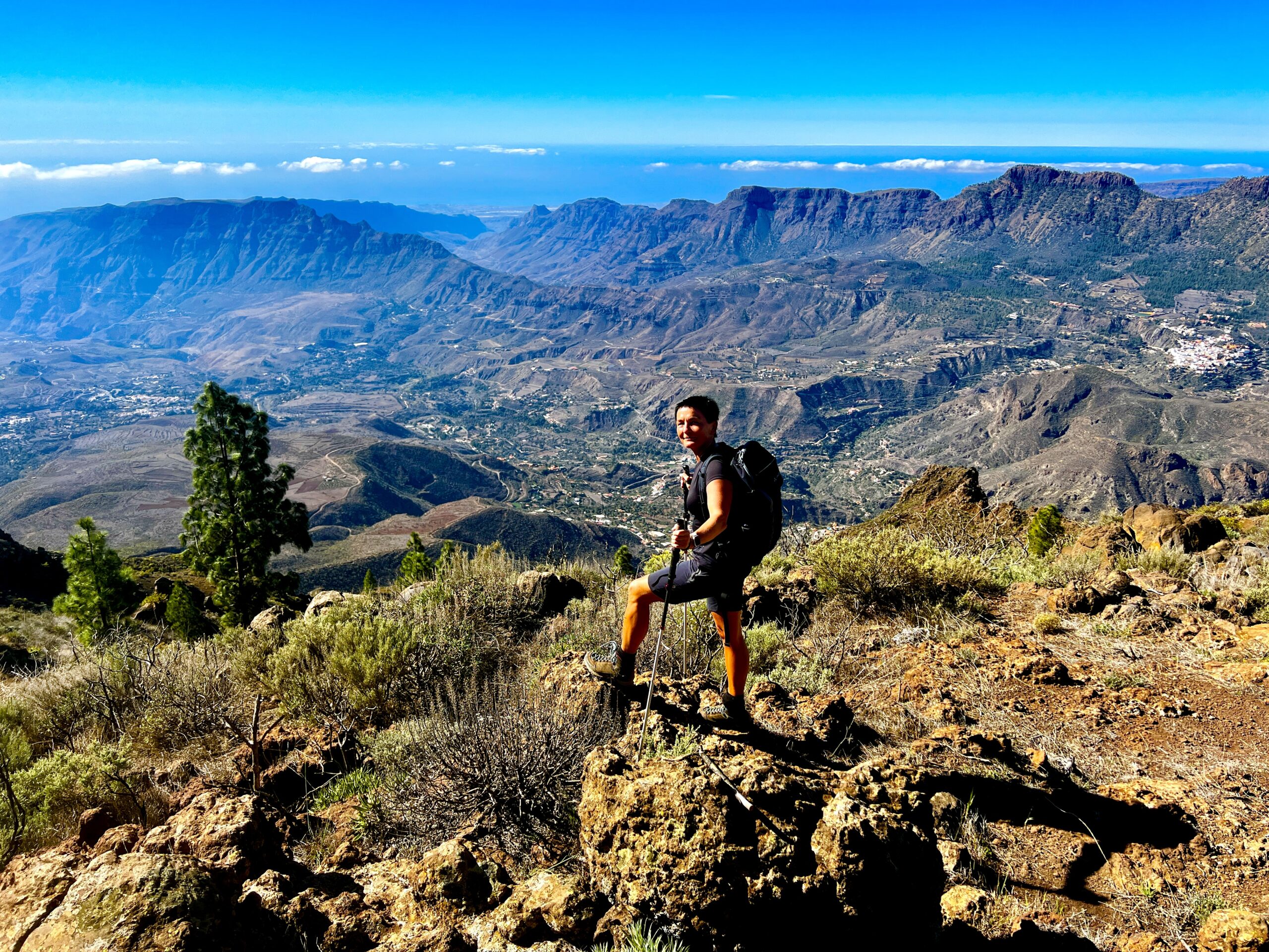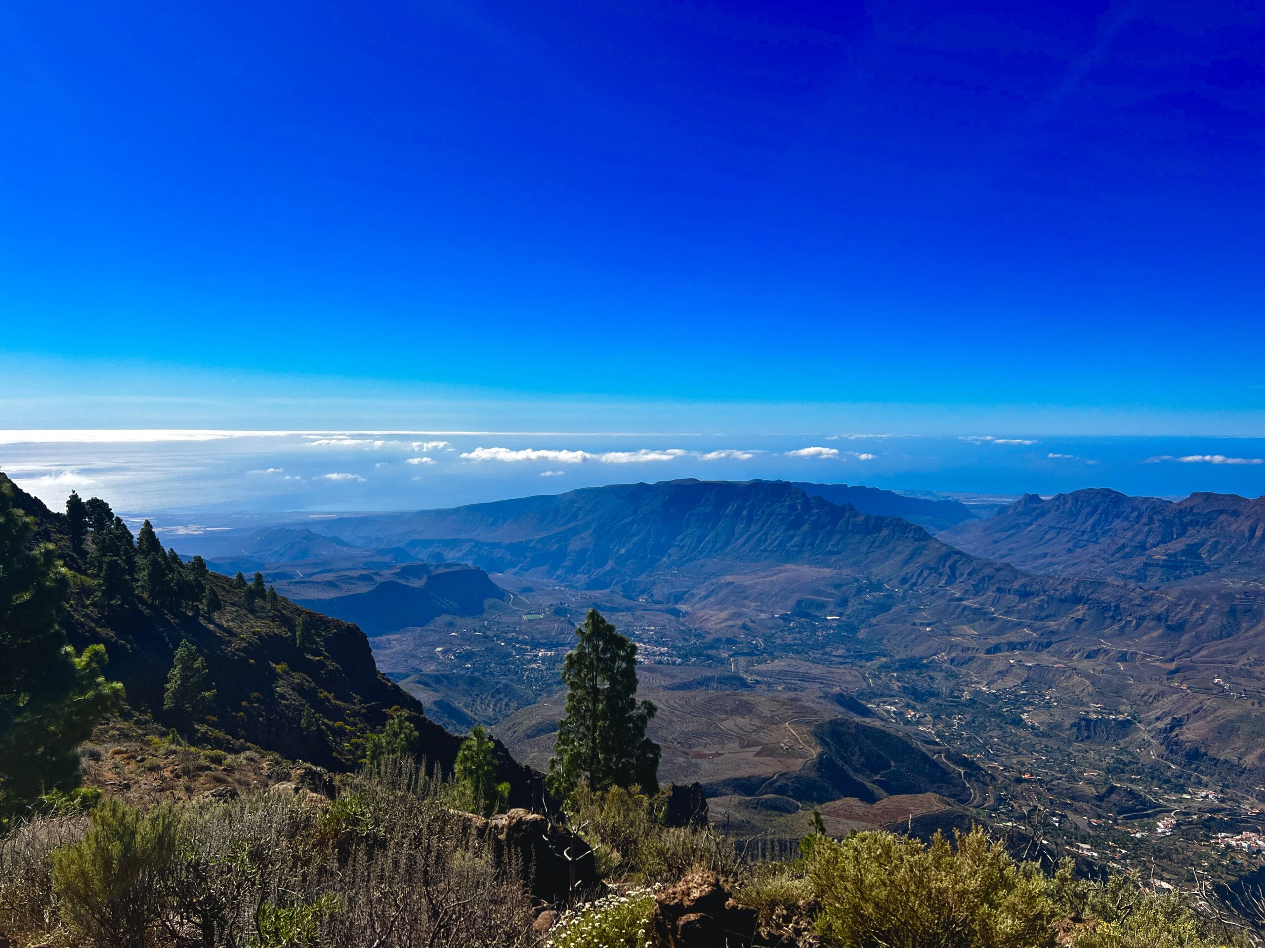 Unsere Tour startete an einer Steilkurve der Lugar Cuevas Blancas (GC-130), wo man bequem sein Auto abstellen kann. Der Weg folgt zunächst durch eine sanft gewellte, von lichten Kiefernhainen durchsetzte Landschaft, die leider in 2022 dem Brand zum Opfer gefallen ist. Man kann hier aber sehr gut sehen, wie die Natur sich selbst regeneriert. Wir folgen der Ausschilderung Santa Lucia und sehen im Südwesten den kuppelförmig aufragenden Montañón (1783m). Bevor wir unserem Wanderweg in Richtung Cruz del Socorro weiter folgten, biegen wir rechts ab in Richtung Santa Lucia, um den grandiosen Ausblick auf das Dorf und auf San Bartolome zu genießen.