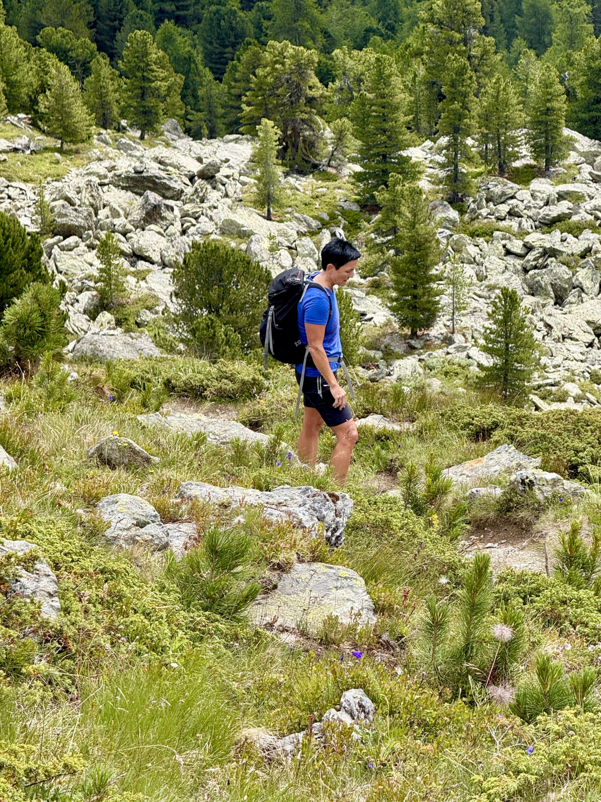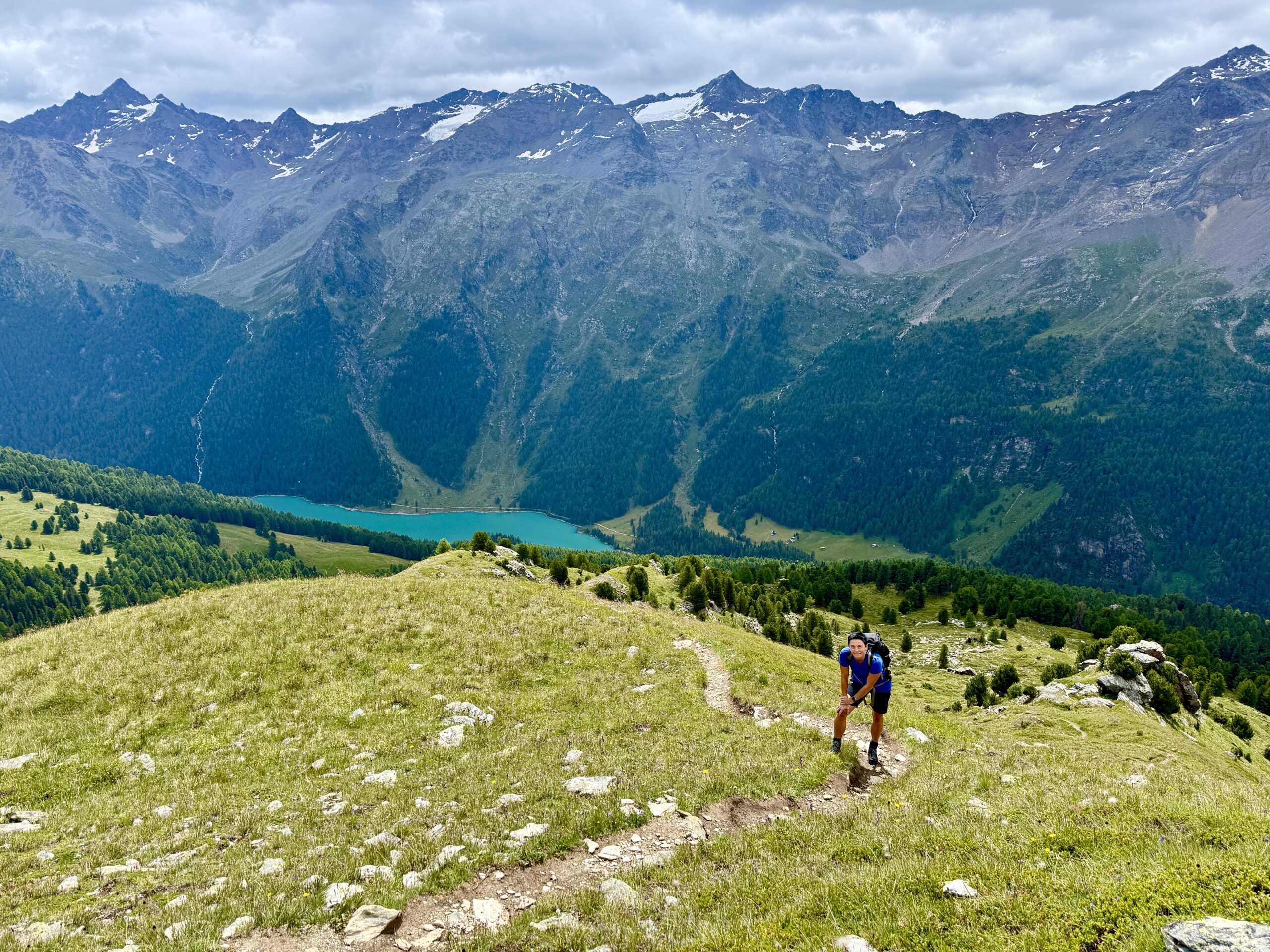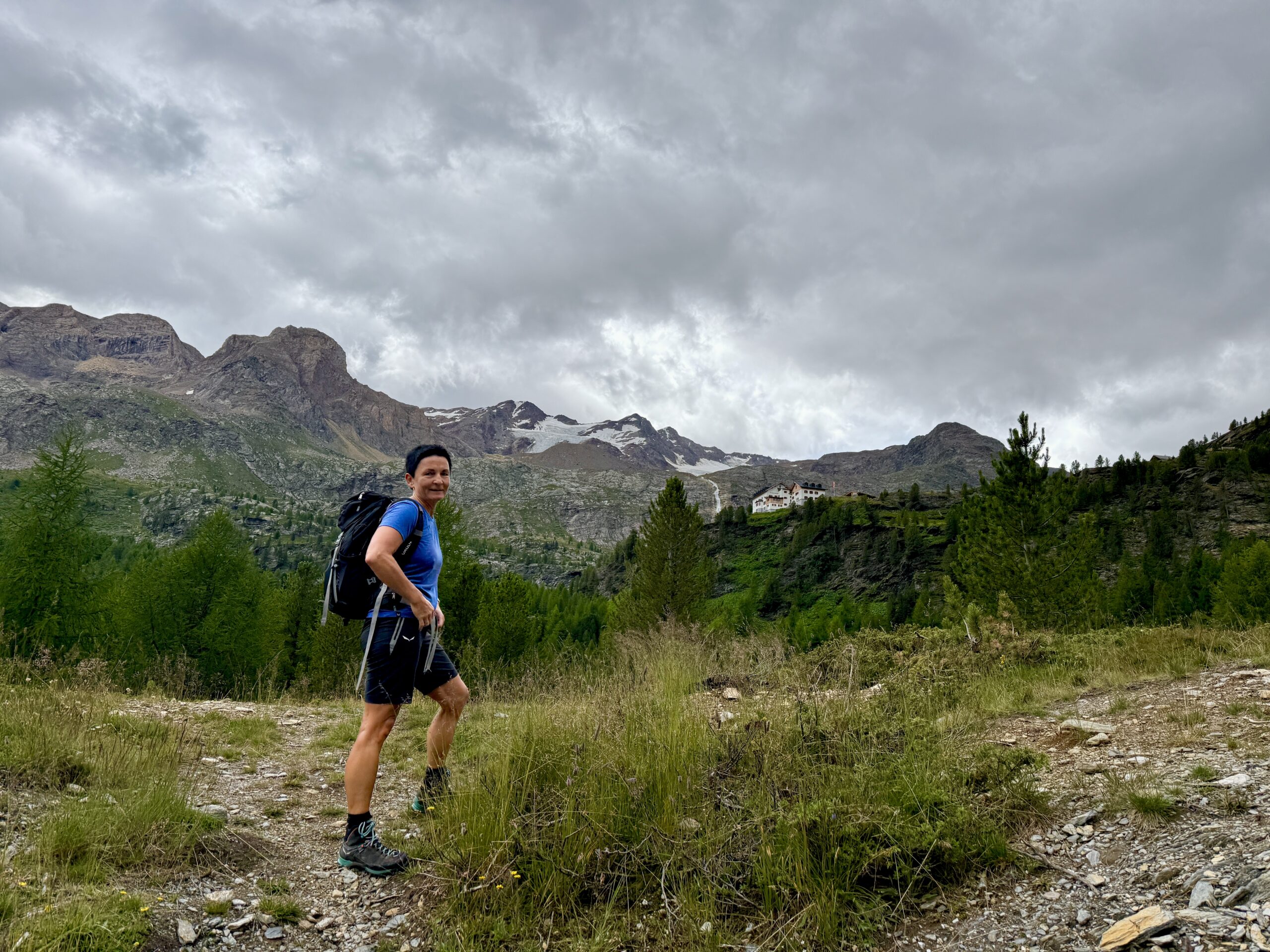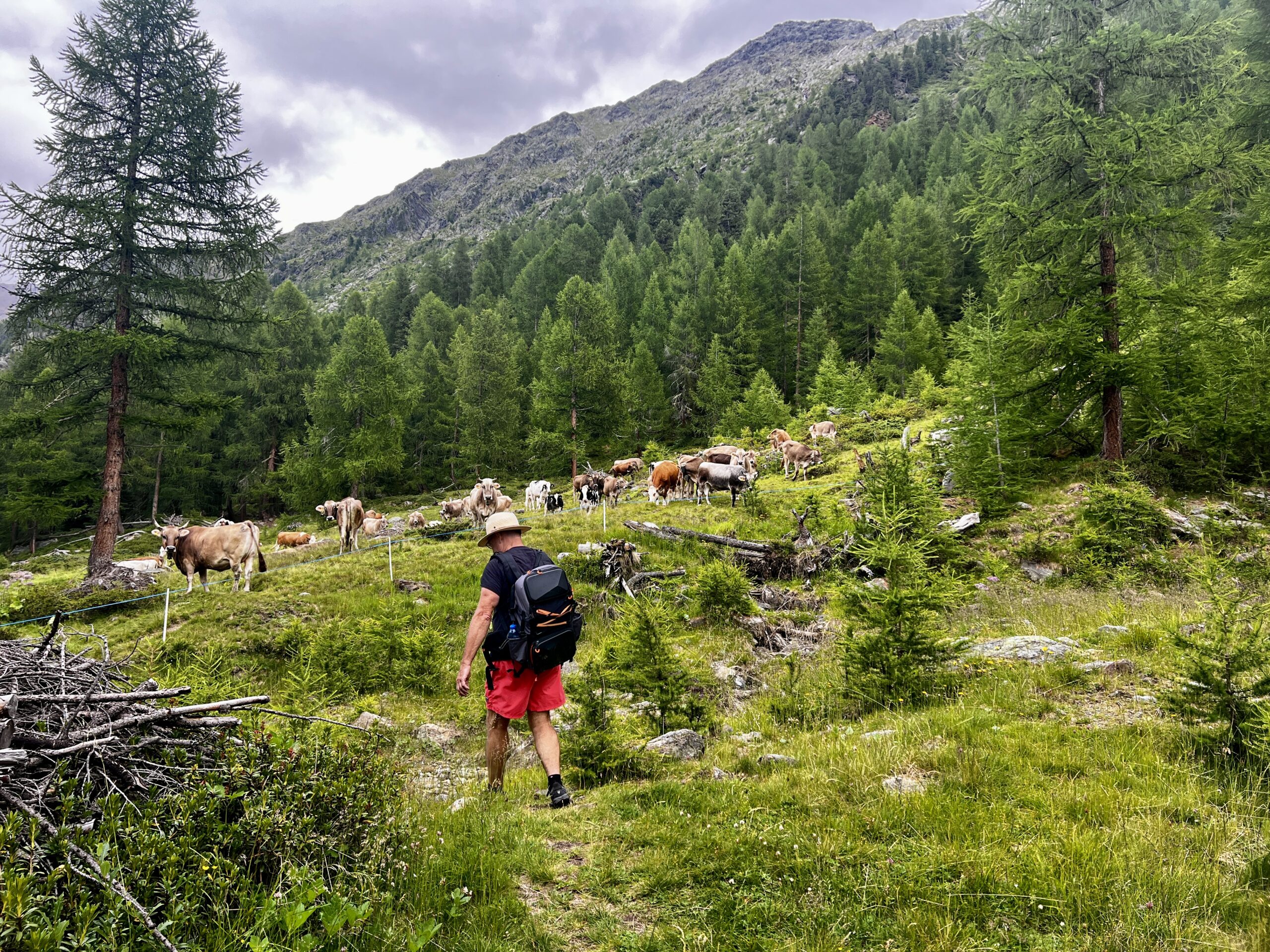 Vom Gipfel geht es zurück zum Hauptweg, dann auf Steig Nr. 39 südwärts steil hinab zur Peder Stieralpe (2252 m). Dort folgt man dem alten Militärweg Nr. 20 weiter talwärts in Richtung der ehemaligen Borromeohütte und schließlich weiter zur Zufallhütte (2265 m). Diese liegt eindrucksvoll oberhalb der Plimaschlucht. In der Zufallhütte machten wir genau zur richtigen Zeit eine Pause – als der Himmel plötzlich seine Schleusen öffnete und uns mit Regen überraschte. Glücklicherweise konnten wir diesen Regenschauer gemütlich bei einer herzhaften Knödelsuppe sowie Kraut mit Wurst und Knödel und einer herrlichen Aussicht auf die Natur genießen.
