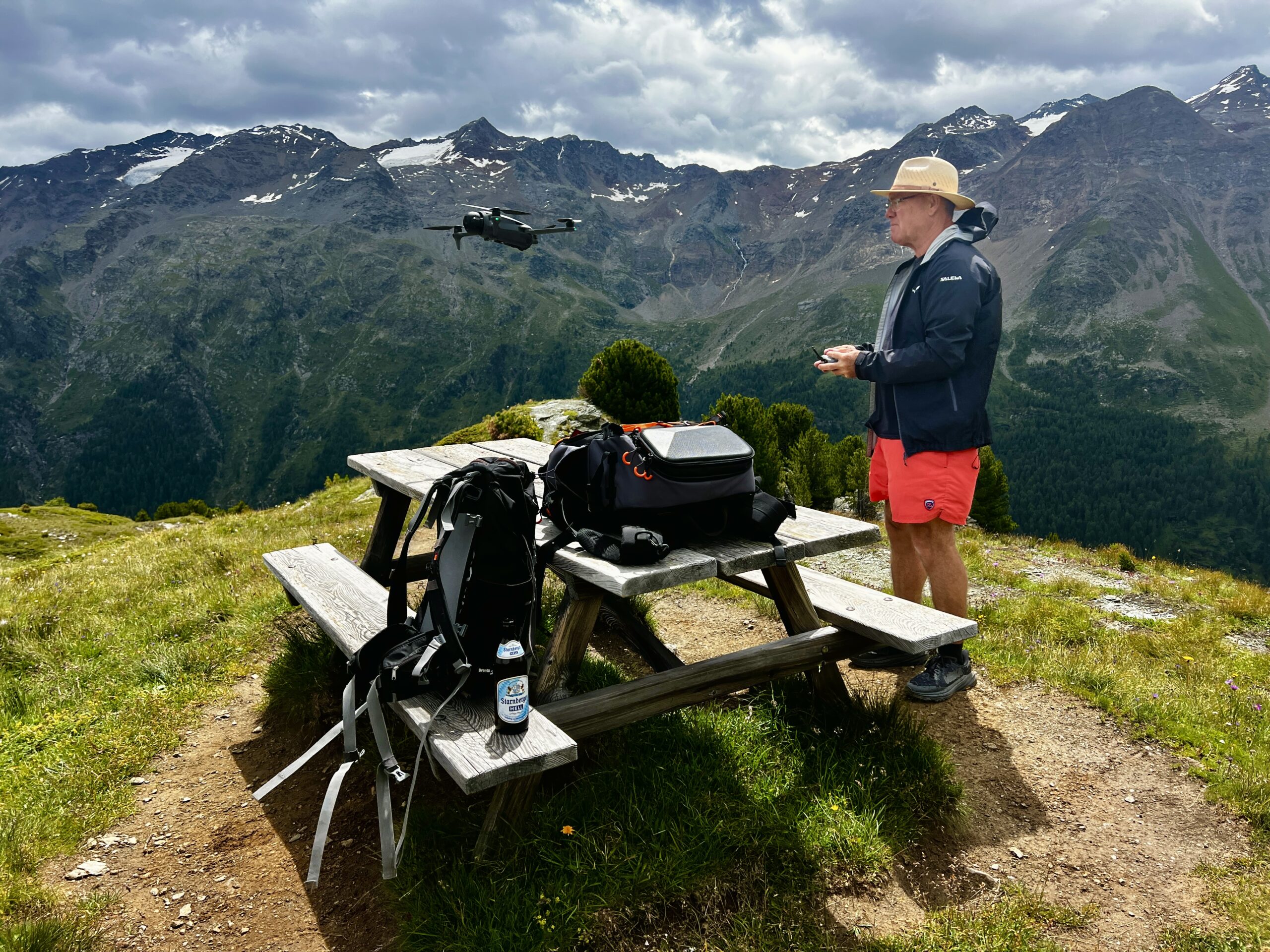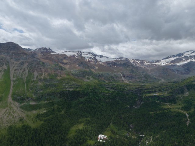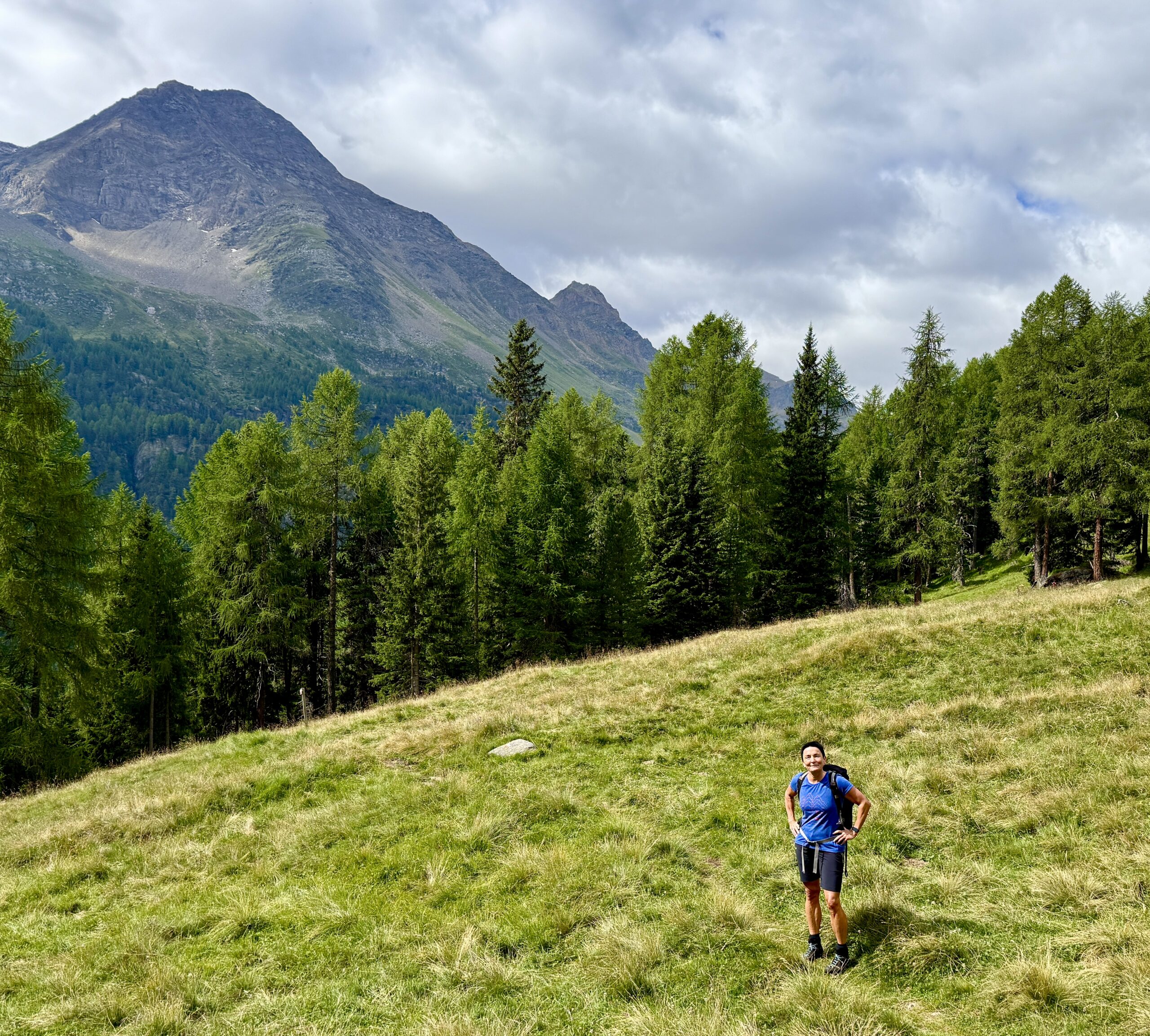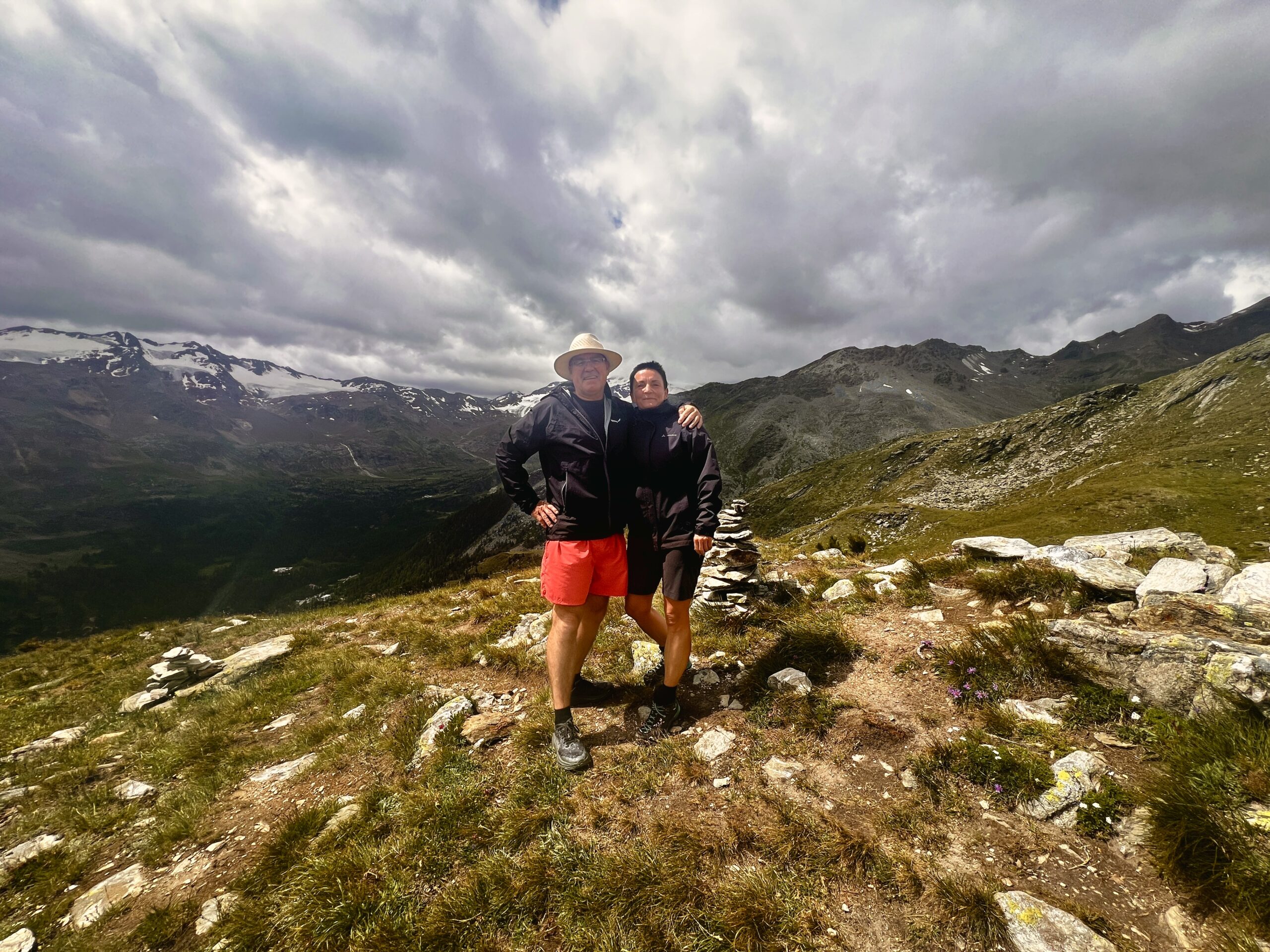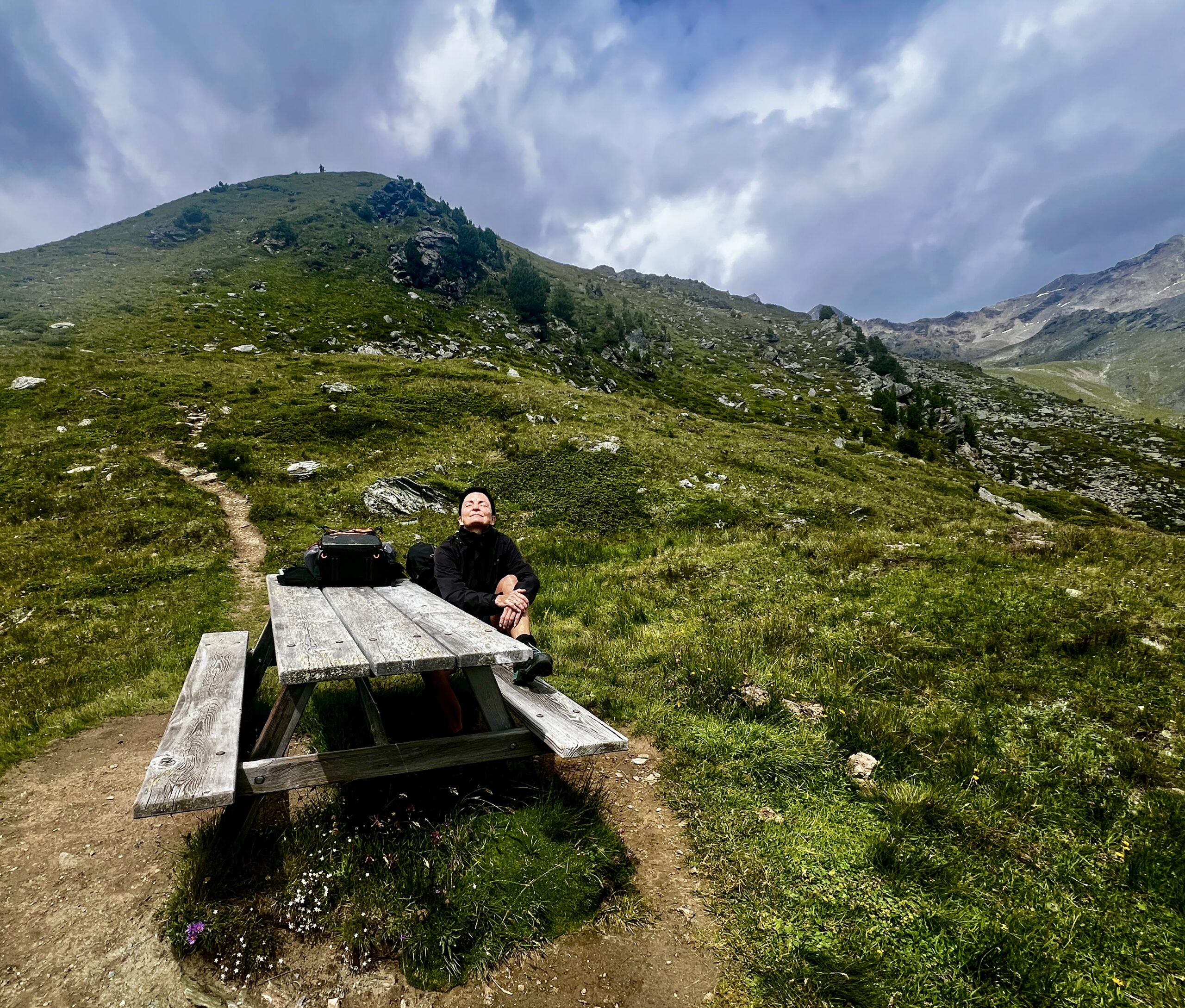 Vom Gipfel geht es zurück zum Hauptweg, dann auf Steig Nr. 39 südwärts steil hinab zur Peder Stieralpe (2252 m). Dort folgt man dem alten Militärweg Nr. 20 weiter talwärts in Richtung der ehemaligen Borromeohütte und schließlich weiter zur Zufallhütte (2265 m). Diese liegt eindrucksvoll oberhalb der Plimaschlucht. In der Zufallhütte machten wir genau zur richtigen Zeit eine Pause – als der Himmel plötzlich seine Schleusen öffnete und uns mit Regen überraschte. Glücklicherweise konnten wir diesen Regenschauer gemütlich bei einer herzhaften Knödelsuppe sowie Kraut mit Wurst und Knödel und einer herrlichen Aussicht auf die Natur genießen.