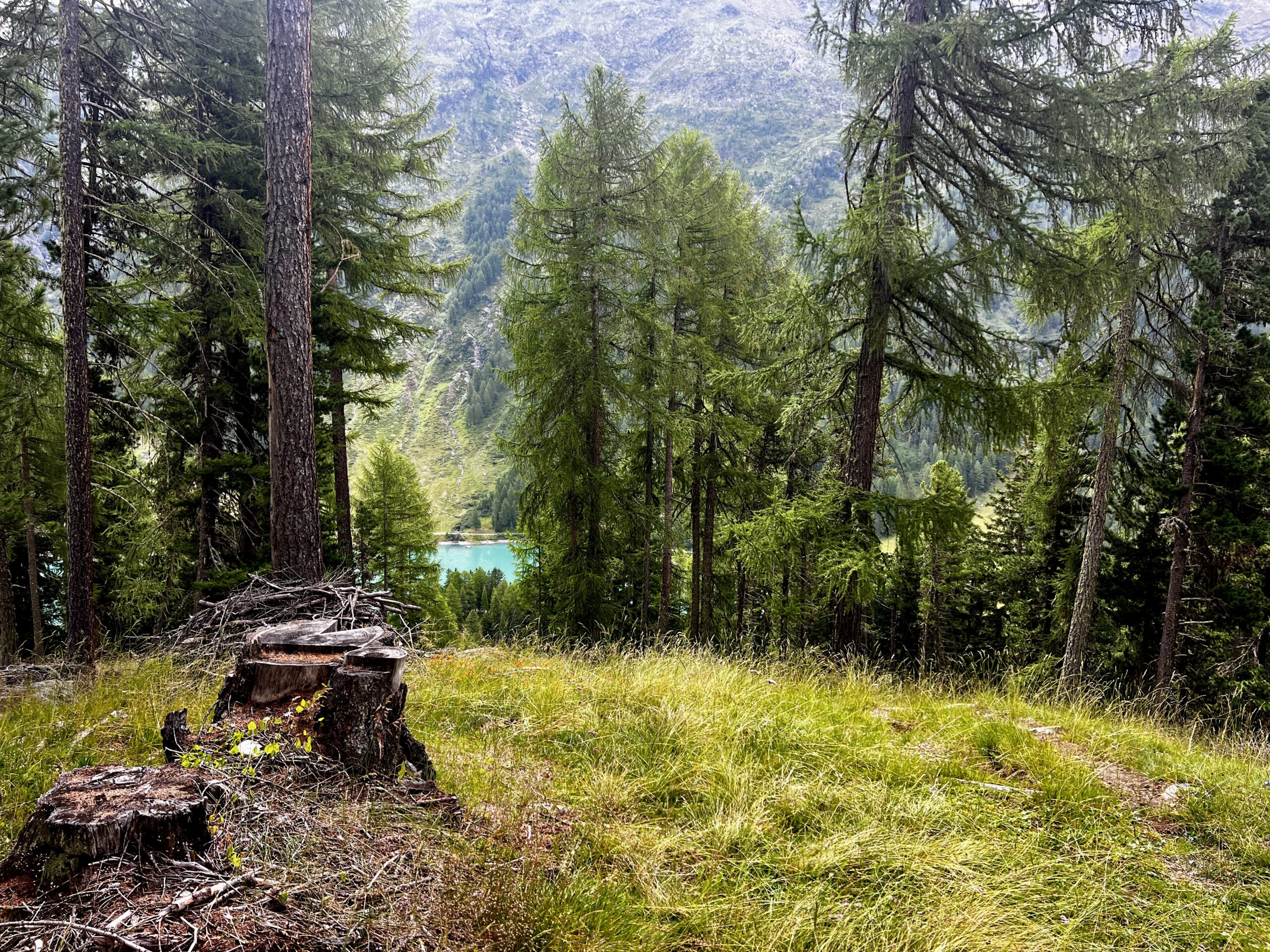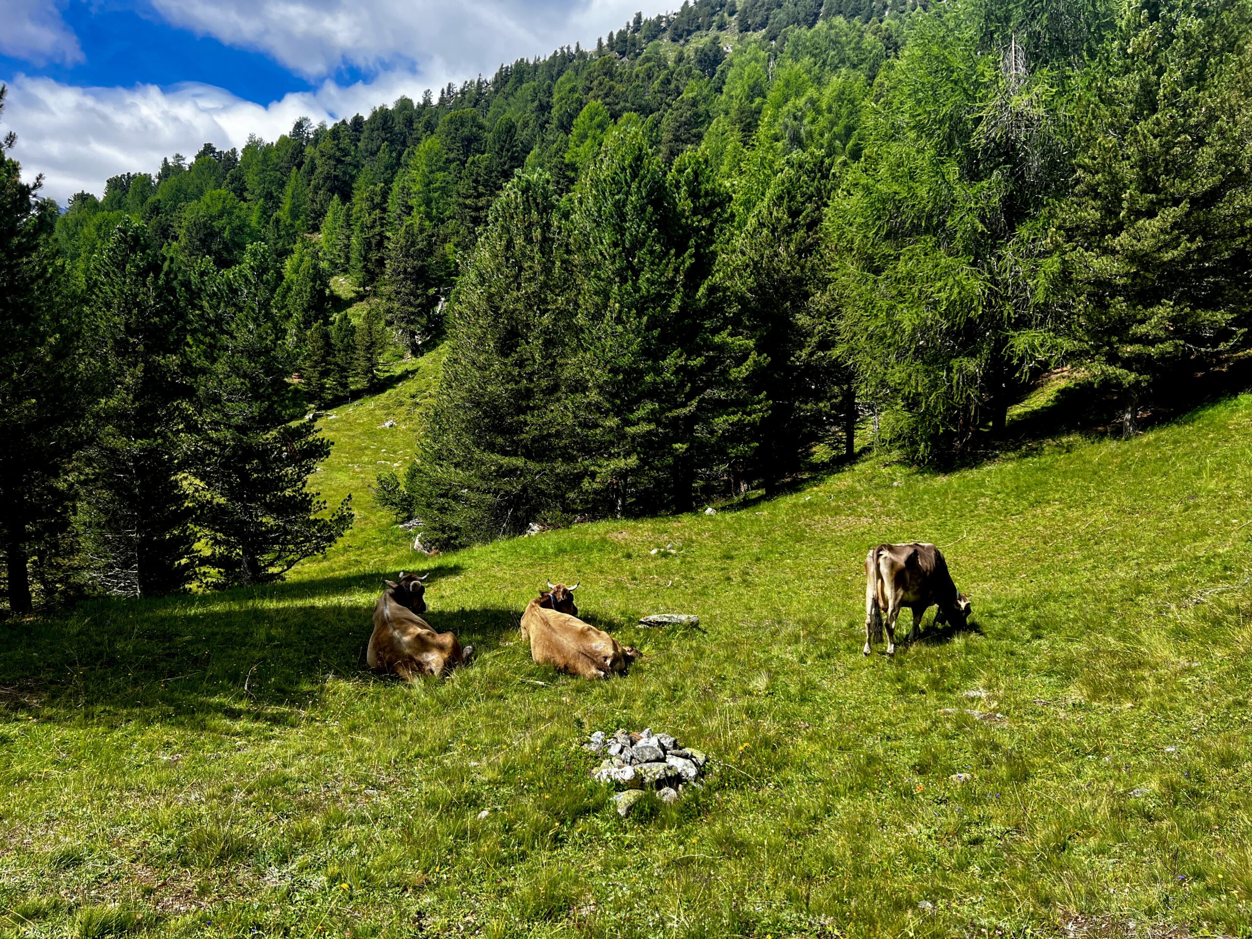 Wegbeschreibung: Die Tour startet direkt am Zufrittsee, unterhalb des Gasthofs Zufritt. Zunächst quert man die Straße und folgt dem Steig Nr. 10 in angenehmer Steigung durch Wald und über eine Wiese zur Lyfialm (2165 m). Hier laden freie Rastplätze auf einer Waldlichtung zur ersten Pause ein.
