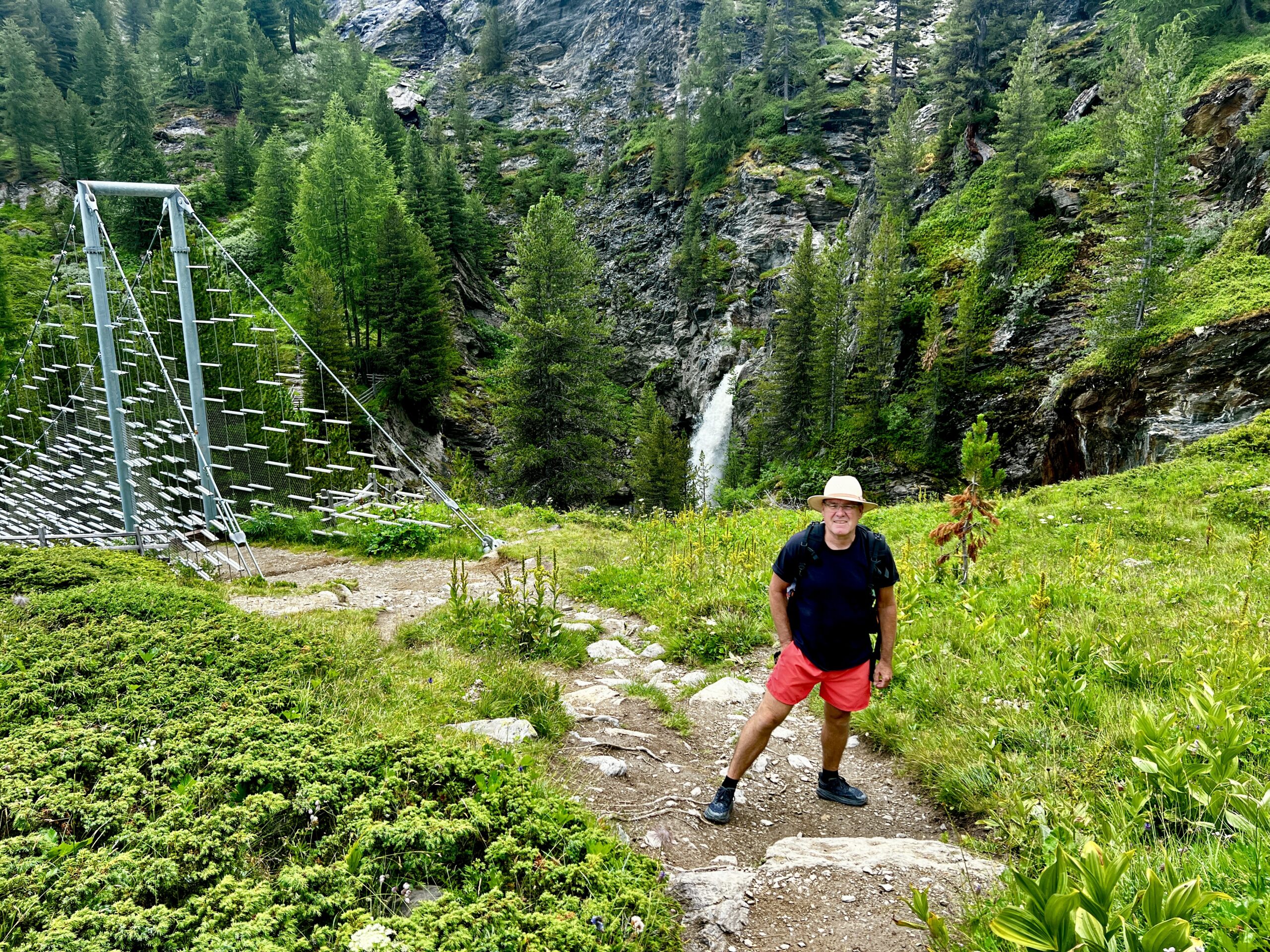 Nach der Einkehr folgt man kurz dem Rückweg, dann aber rechts abzweigen und über die spektakuläre Hängebrücke die Plimaschlucht überqueren.